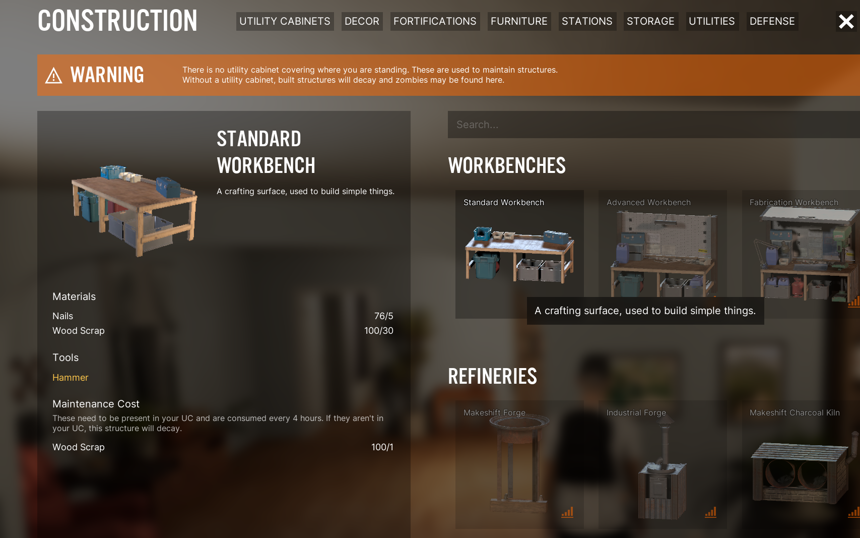 Bキーで建築メニューを開くと、建物のパーツや家具のほかに「ワークベンチ」という施設を発見。
