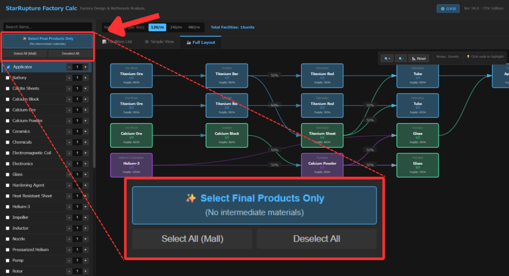• Select All (Buffering Mode): In addition to the “Target Item” requirements, this mode adds one extra facility for every intermediate resource to ensure you always have a surplus for manual usage/storage.