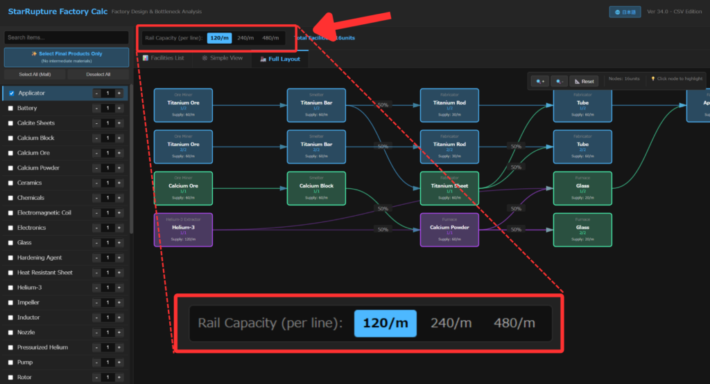 You can set the Rail Level for your entire line. If the production volume exceeds the capacity of your current Rail Level, the calculator automatically adjusts by increasing the number of facilities to ensure the supply line never stalls.