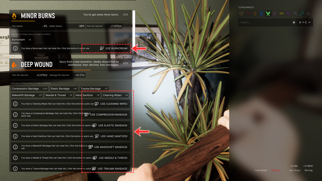 If you’re unsure how to deal with a condition, open the Medical tab by pressing [I]. It provides clear hints on how to treat your current status.