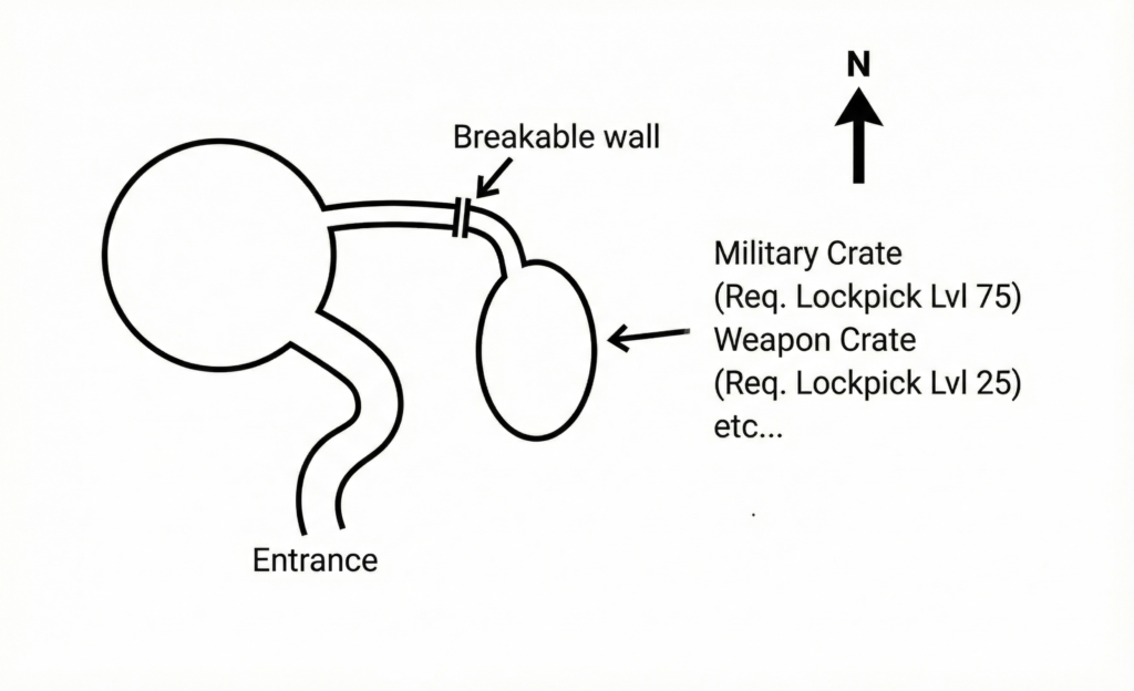 - Lockpicking Skill (75+): While Lvl 25 allows you to open the weapon cases, you need Lvl 75 to access the five footlockers. To fully loot this area, a high skill level is essential.