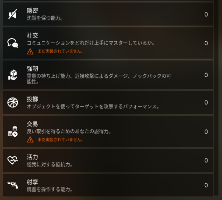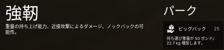 | 強靭 Strength | 所持重量UP、近接性能の一部向上。 | 近接攻撃(壁殴りや伐採も対象)/オブジェクト移動/重量超過で歩く/エクササイズ | ◎ |
