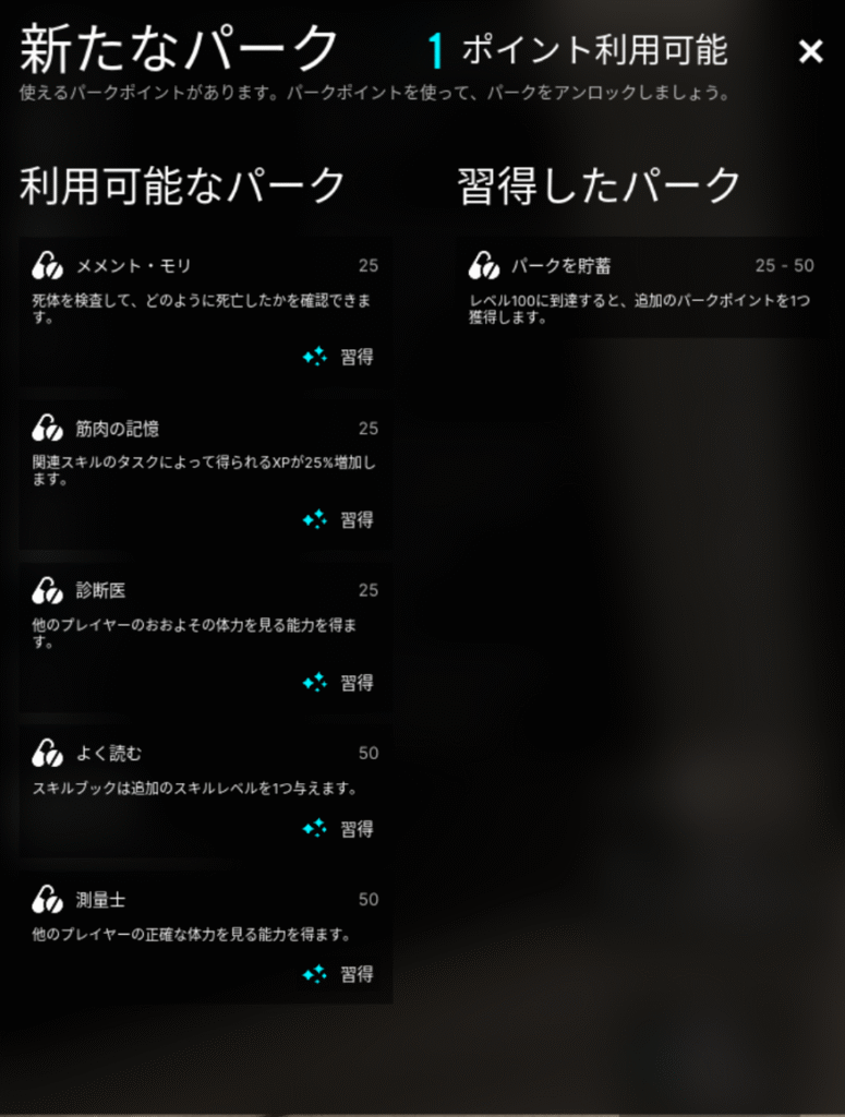 | 医学 Medical | 高度な医療アイテム作成に必要。パークで他プレイヤーHP確認可能 | 傷の治療/アイテムをクラフト(包帯など) | ◯ |