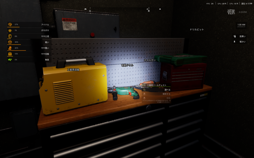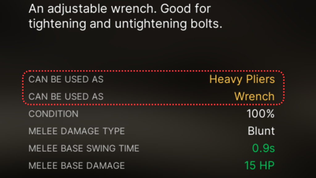 主にクラフト、車両のパーツ取り外し、建物の修理に使用します。