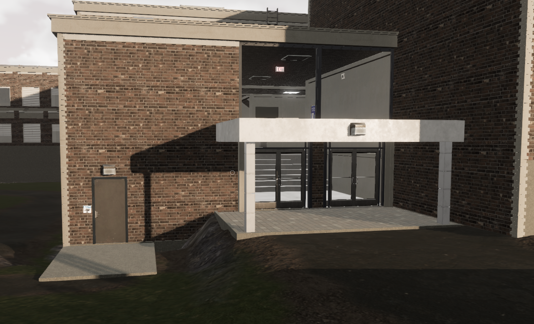 エリア一帯は高い外壁に囲まれている。通用口の近くに建てられている守衛所内にある赤いボタンを押すことでゲートを開閉することができる。