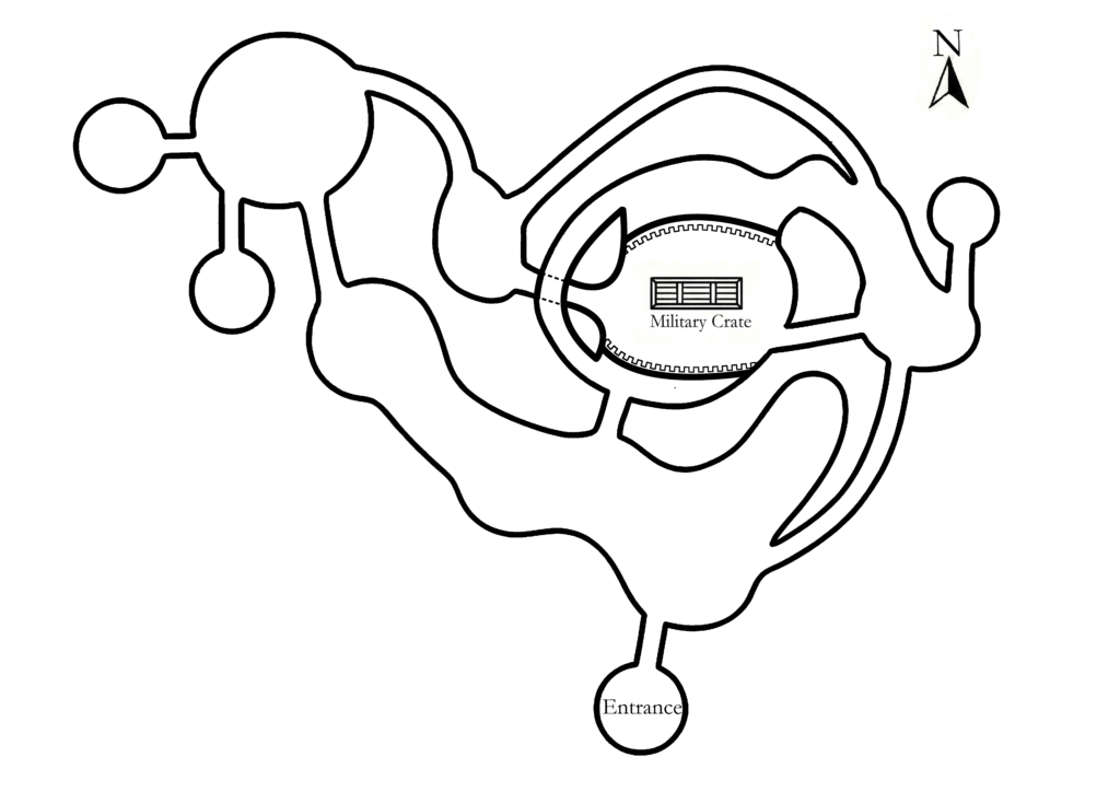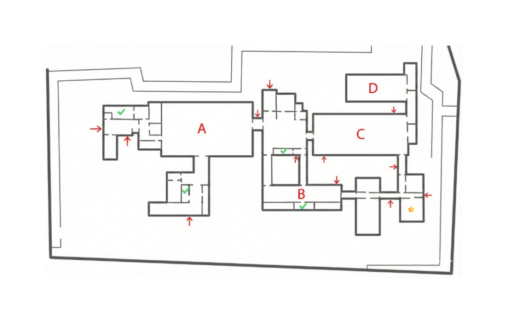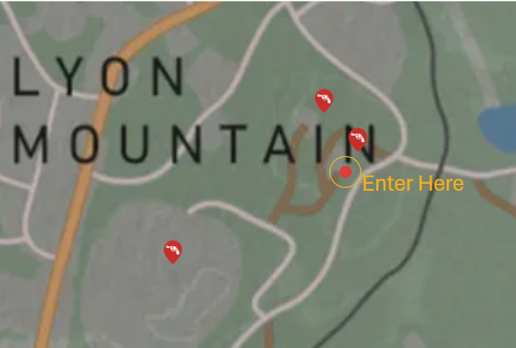 侵入方法: 施設は高い壁で囲まれています。侵入するには、ゲート近くにある小さな「守衛小屋」を探してください(地図上で確認できる3か所の道路が内部につながっている部分)。小屋の中で壁にある赤いボタンを押すとゲートが開きます。
